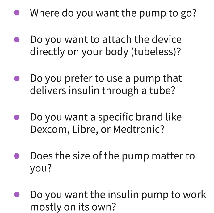 The American Diabetes Association offers a consumer guide that'll help you compare different insulin pumps. But when Barry meets someone who's considering one, she'll ask questions such as: